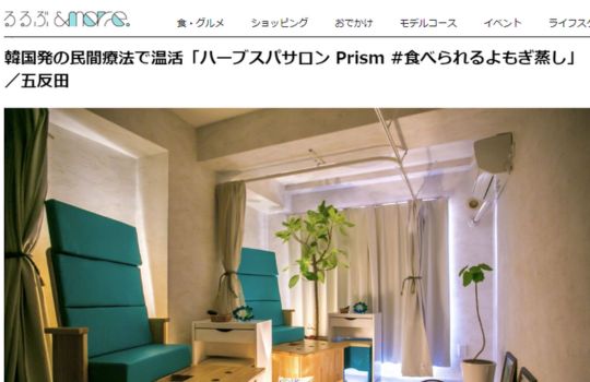 品川区西五反田にある美容サロン、Prism#食べられるよもぎ蒸しが「るるぶ&more.」に掲載されました。「渡韓気分を満喫!都内で体験できる韓国カルチャー3選」の中で選ばれました。 詳細はリンク先よりご覧いただけます。